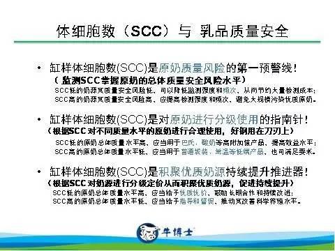 乳品质量的提高,离不开规范化的饲养、挤奶、运输,在规范化的养殖模式下,奶牛更卫生,更健康,但这只是好奶源的******步,要衡量生鲜乳整体质量的高低,还离不开一个非常重要的指标,那就是视频中所提及到的牛奶的体细胞数(SCC)。那么,什么是牛奶的体细胞数呢?它意味着什么?它与乳品质量控制以及牧场管理分别有着怎样的联系呢?下面小编就为大家一一进行解答。